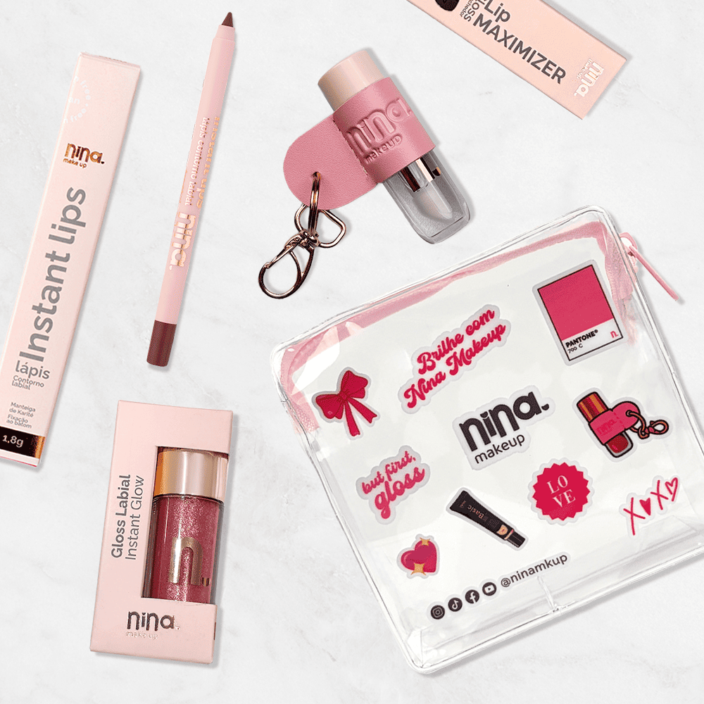 Além dos três produtos icônicos, Gloss Labial Instant Glow Diamond, Gloss Preenchedor Lip Maximizer Clear e Lápis Contorno Instant Lips Princípio, o kit acompanha uma necessaire exclusiva Nina Makeup e um chaveiro Golden Gloss.